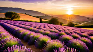 Adembenemend panorama van een golvend lavendelveld tijdens zonsondergang in de Provence. De paarse lavendel contrasteert prachtig met de gouden gloed van de ondergaande zon over de heuvels. perfect voor sfeervolle wanddecoratie, reisbrochures of promotie van zuidelijke bestemmingen. De warme kleuren en organische lijnen creëren een rustgevende m...