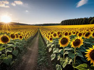 Adembenemend landschap van een eindeloos zonnebloemenveld tijdens zonsondergang. Een onverharde landweg snijdt als een lint door het goudgele bloemenveld, terwijl de zon haar laatste stralen over de horizon werpt. perfect voor thema's als Nederlandse landbouw, duurzaamheid en natuurlijke schoonheid.