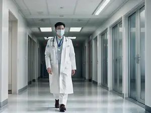 Zorgprofessional in ziekenhuisgang met medisch mondkapje AI-gegenereerd