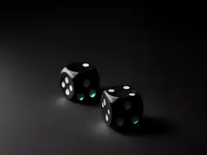 Stijlvolle close-up van twee zwarte dobbelstenen met witte stippen tegen een donkere achtergrond. De dramatische belichting creëert een mysterieuze sfeer en laat de glanzende oppervlakken perfect uitkomen. perfect voor concepten rond gokken, spelletjes, risico's en kansen.