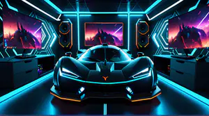 Een glanzende zwarte hypercar met opvallende blauwe en oranje neonaccenten staat centraal in een ultramoderne gaming setup. De ruimte wordt verlicht door strakke blauwe neonlijnen die langs de wanden en het plafond lopen. Op de monitoren rondom de auto zijn levendige paars-roze game scenes te zien van een fantasielandschap. Deze perfecte combinatie van gaming technologie en automotive design creëert een ultieme cyberpunk sfeer.