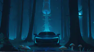 Een futuristische zwarte hypercar met stijlvolle blauwe neonaccenten staat op een bospad in een betoverend nachtelijk woud. Direct voor de auto rijst een gigantische, lichtgevende paddenstoel omhoog die het hele tafereel in een etherisch blauw licht baadt. Kleine glinsterende paddenstoelen omringen het pad, terwijl het maanlicht door de bomen schijnt en lichtdeeltjes in de mistige lucht zweven.