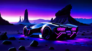 Een glanzende zwarte futuristische hypercar met opvallende neonroze achterverlichting staat geparkeerd in een buitenaards woestijnlandschap. Dramatische rotsformaties rijzen op tegen een kleurrijke retrowave hemel met paarse en blauwe gradiënten. De gehele scène is gehuld in een surreële paarse gloed, terwijl de scherpe hoeken van de auto worden geaccentueerd door felroze neondetails die reflecteren op de rotsachtige ondergrond.