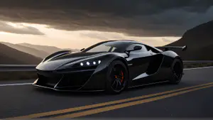 Een elegante zwarte hypercar met heldere LED-koplampen en oranje remklauwen staat op een bergweg tijdens de schemering. De dramatische wolkenlucht en bergsilhouetten creëren een moody sfeer, terwijl de gele wegmarkering contrast biedt tegen het donkere asfalt. Het warme avondlicht accentueert de aerodynamische lijnen van dit exclusieve voertuig.