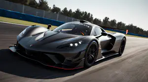 Deze matzwarte hypercar met rode details raast over een professioneel racecircuit tijdens een intensieve testsessie. Met zijn gespierde aerodynamische vormgeving, inclusief scherpe carbon fiber details en een agressieve achtervleugel, belichaamt deze bolide pure racetechnologie. De lage zitpositie en gestroomlijnde carrosserie onderstrepen het competitieve karakter van deze extreme circuitauto.
