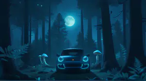 Een zwarte sportwagen met opvallende turquoise neonverlichting rijdt over een bospad onder het licht van een volle maan. De misterieuze nachtelijke setting wordt verlevendigd door grote lichtgevende paddenstoelen die langs het pad groeien, terwijl zachte blauwe nevel tussen de hoge dennenbomen hangt. De maansverlichting schijnt door de bomen en creëert een sprookjesachtige, bijna betoverde sfeer.