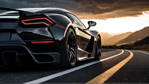 Een elegante zwarte supercar, gefotografeerd vanuit de achterhoek, staat op een slingerende bergweg tijdens het gouden uur. De opvallende rode LED-achterlichten in V-vorm contrasteren mooi met de donkere carrosserie, terwijl de gele wegmarkering naar de bergen in de verte leidt. Het warme avondlicht baadt het berglandschap in een cinematische gloed.