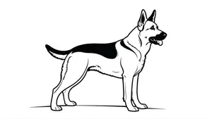 Stoere Duitse herder kleurplaat voor kinderen. Deze waakzame hond staat fier met zijn tong uit zijn bek. De zwarte rug en staart geven aan waar donkere kleuren gebruikt kunnen worden. Perfect voor kinderen die van honden houden. De duidelijke lijnen maken het makkelijk om in te kleuren. Print deze gratis kleurplaat voor thuis of school. Ideaal voor hondenliefhebbers en kinderen die huisdieren willen kleuren.